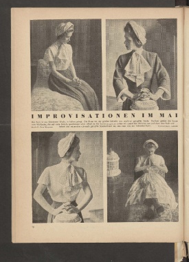 Der Rock ist aus kirschroter W olle, in Falten gelegt. Die Bluse mit der großen Schleife aus w eiß-rot getupfter Seide. Darüber gehört die kurze