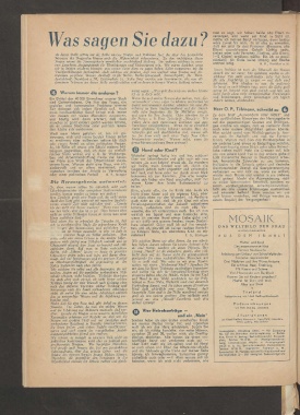 manches so ganz anders gelöst w erden könnte, der Presse, z. B. Ih re r Z e it s h r if t „ M o s a ik " ! W ir H e rr O . P., Tübingen, schreibt zu